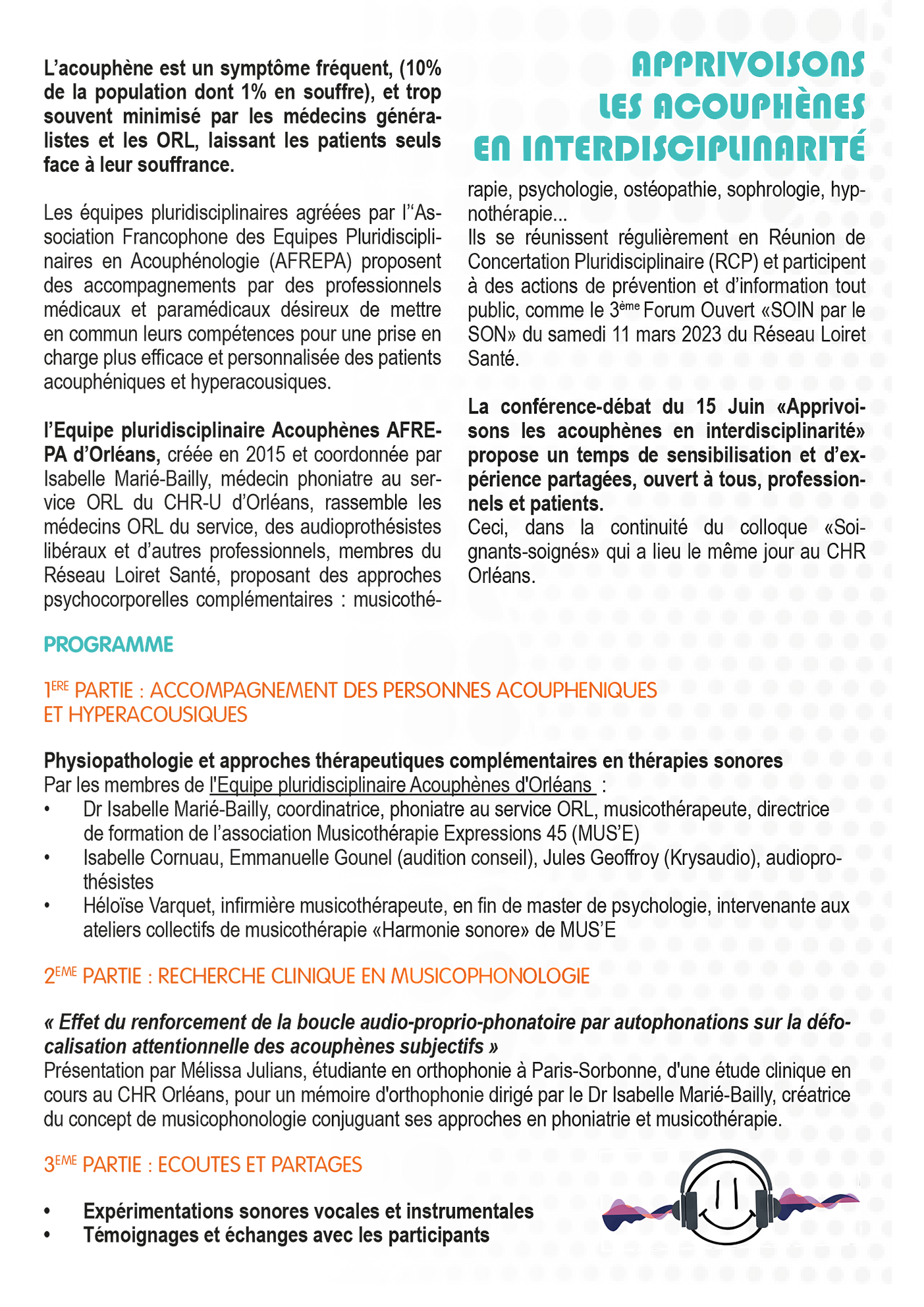 La conférence-débat du 15 Juin « Apprivoisons les acouphènes en interdisciplinarité » propose un temps de sensibilisation et d’expérience partagées, ouvert à tous, professionnels et patients. Ceci, dans la continuité du colloque « Soignants-soignés » qui a lieu le même jour au CHR-U d’Orléans.
