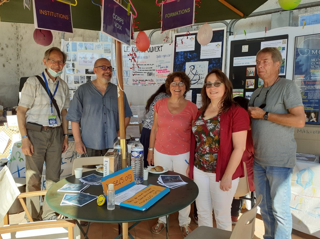 Venez nous retrouver Place du Martroi (zone Z1, emplacement 114) : vous y rencontrez les divers professionnels de santé actuellement membres du RLS, (médecin phoniatre, musicothérapeute, hypnothérapeute, sophrologue, praticien en Art Martial Sensoriel, ostéopathie, psychomotricité…), des associations de santé et leurs patients ressources, désireux de prendre soin de la relation en intelligence collective.