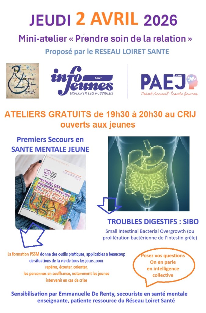 - 19h30 : mini-atelier « Premiers Secours en Santé Mentale » et/ou pathologie digestive SIBO https://hopital-europeen.fr/institut-europeen-du-sibo avec Emmanuelle De Renty, enseignante, patiente ressource